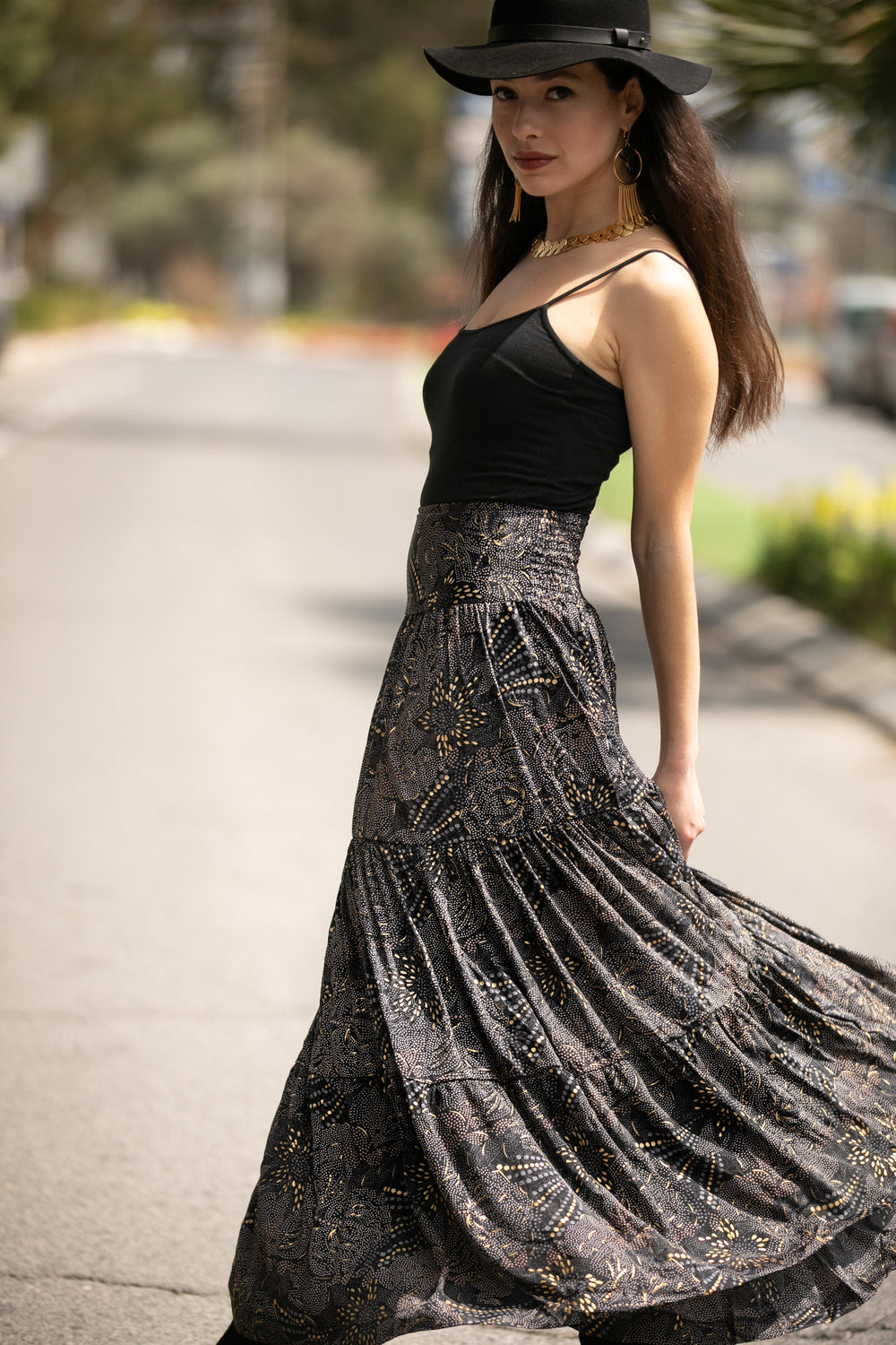 This beautiful flared maxi skirt brings a fresh take on effortless boho elegance. With its flowy silhouette, tiered construction, and flattering high waist, this skirt is ideal for day-to-night wear. Pair it with a tucked-in tank, fitted blouse, or chunky sweater for year-round style. The elastic waistband ensures all-day comfort, while the soft fabric and vibrant prints make it a standout piece in any wardrobe.