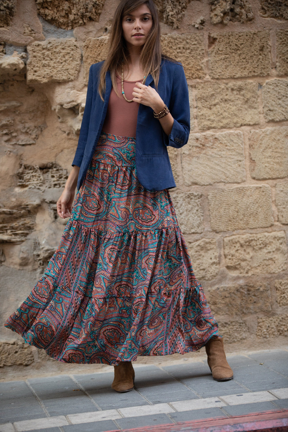This beautiful flared maxi skirt brings a fresh take on effortless boho elegance. With its flowy silhouette, tiered construction, and flattering high waist, this skirt is ideal for day-to-night wear. Pair it with a tucked-in tank, fitted blouse, or chunky sweater for year-round style. The elastic waistband ensures all-day comfort, while the soft fabric and vibrant prints make it a standout piece in any wardrobe.