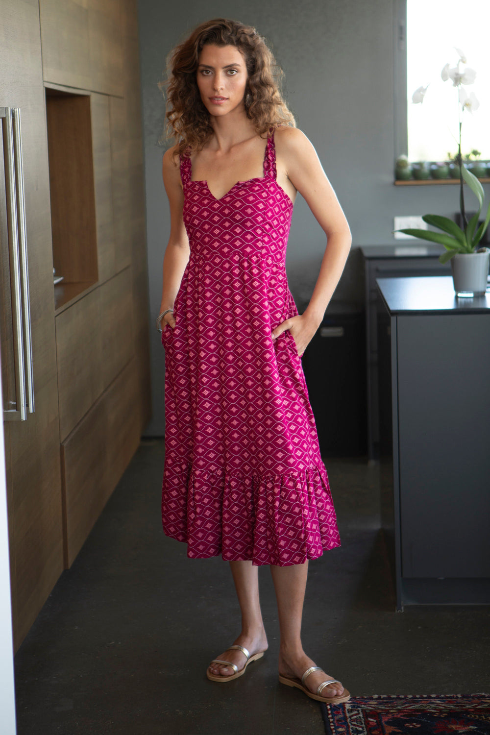 The Valeria Dress features an empire waist, a square neckline, pockets, and a relaxed, flowy skirt. Stretchy shoulder straps and a back elastic band provide a flexible, easy fit that flatters the bust and waist while offering comfort and movement.