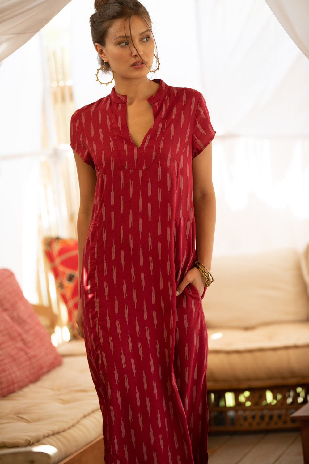 The split neckline and short sleeves bring a refined yet relaxed feel. Whether you wear it at home, out for brunch, or on vacation, it's the ultimate day-to-night piece. The pockets add practicality without sacrificing elegance.